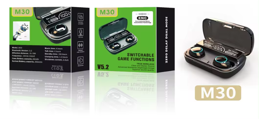 Experience the TWS True Wireless Gaming Earphones M30, featuring HIFI Stereo sound, IPX-7 waterproofing, and BT5.2 for seamless connectivity. Equipped with hybrid technology, LED display, and a 600mAh battery, these earbuds are ideal for gaming, sports, and daily use. Enjoy wireless freedom with a 1-year warranty and versatile compatibility across mobile, PC, and gaming devices.