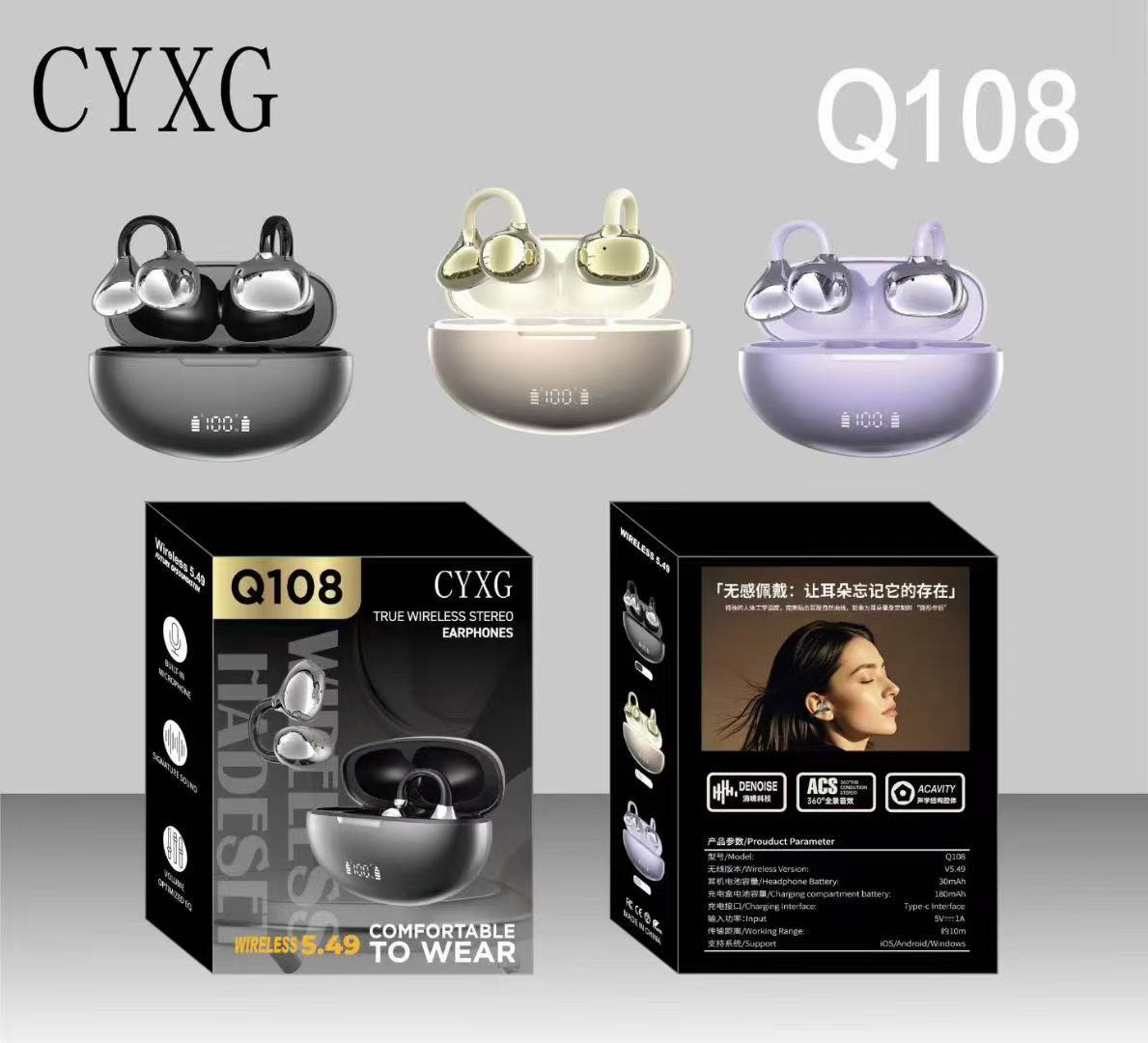 / Q108 Ear Clip Electroplated Appearance Led Power Display True Wireless Earphones Waterproof Hd Call Bone Conduction Headphone