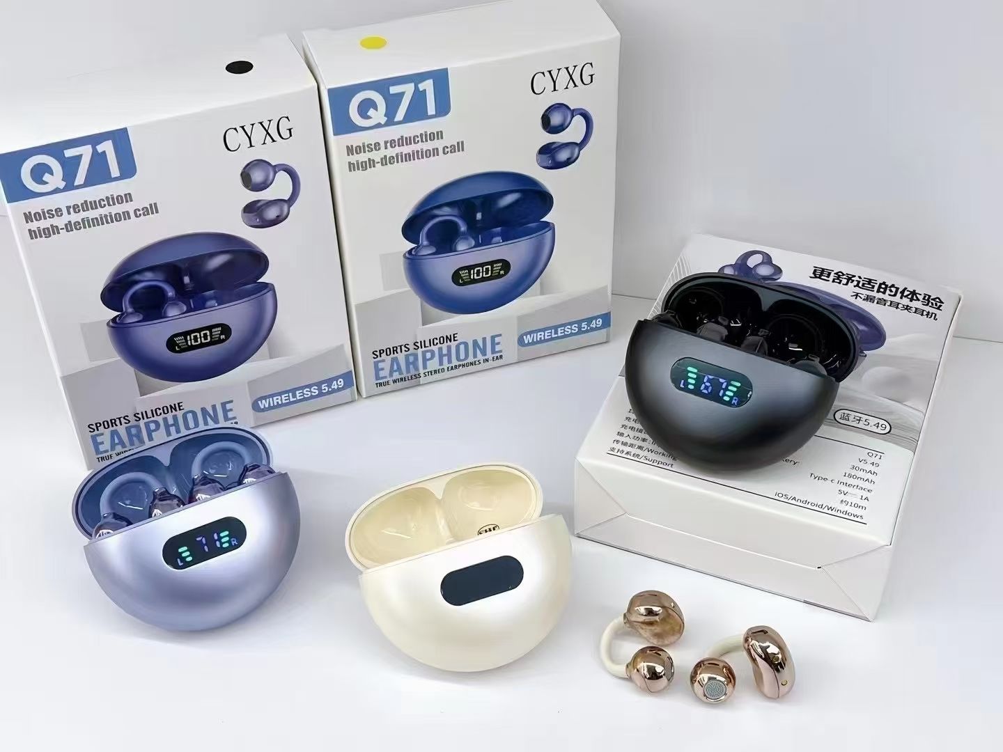 Experience the OEM Q71 OWS Clip-on Earbuds with an electroplated appearance, LED power display, and IPX-5 waterproof rating. Enjoy true wireless freedom, AI HD call quality, and up to 4-6 hours of music playback with a Bluetooth V5.4 connection. The ergonomic ear-clip design ensures comfort for sports and travel, while the TYPE-C charging port offers convenience. Includes a compact charging case with 180mAh battery capacity for extended use.